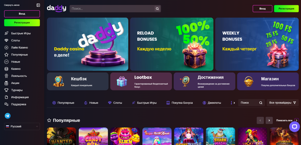 Ассортимент слотов формируется с учетом разнообразия игровых механик, сложности, визуального стиля и наличия бонусов. В каталоге Дэдди доступны следующие категории: